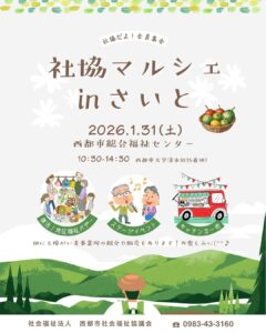 2025/11/13 / 最終更新日時 : 2025/11/13 総務課 お知らせ社協マルシェinさいとを開催します! 西都市社会福祉協議会の活動や西都市総合福祉センターについて 多くの市民の方に知ってもらいたいという思いから『社協マルシェin さいと』の開催を計画しました! あわせて、赤い羽根共同募金への呼びかけも行います! 地域の皆さまが年代や立場を超えて交流できる場となるよう開催します。 詳細につきましては、随時ホームページやインスタグラムを通して案内させて いただきます。お楽しみに!