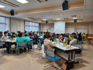 同町の社協では、有事の際に実働できる職員に限りがあることを想定しています。そこで地域の方と協働で災害ボランティアセンターの運営をサポートする体制をつくるために、まずは身近な地域の担い手であるボランティア連絡協議会の役員らや地域住民などを対象とした「地域協働型ボランティアセンター運営研修会」を実施するというので、西都市ボランティア連絡協議会の「リーダー研修会」の一環として一緒に参加させてもらいました。